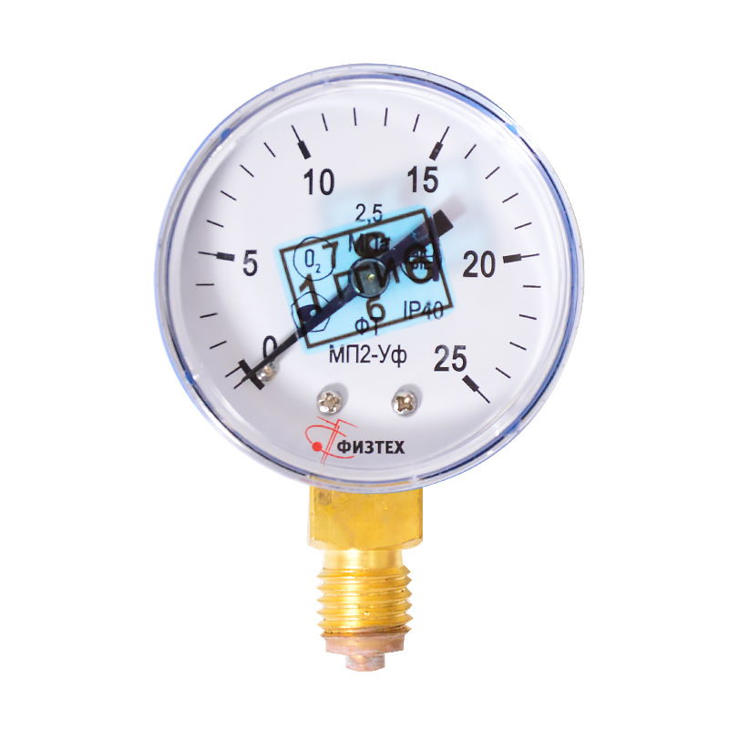 Штуцер имеет радиальное расположение и выполнен из латуни. Предназначен для измерения давления газа при температуре окружающей среды от -60 С до +60 С. Точность 2.5 достигается за счёт применения медной трубки Бурдона – уникального измерительного элемента. Стальной корпус манометра диаметром 50мм защищён техническим (органическим) стеклом, циферблат выполнен из алюминия.