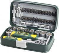 - Инструменты в комплекте: вороток для головок, зубила, ключи имбусовые (шестигранные), ключи торцевые, отвёртки, рукоять для головок, трещотка, 10 x головки торцевые, 2 x удлинитель, 22 x биты, адаптер