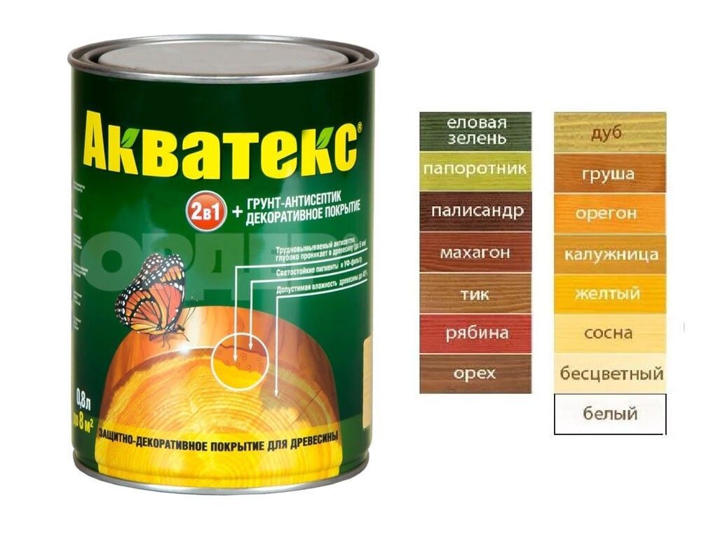 Защитно-декоративное покрытие для древесины Акватекс 2в1: выполняет функции грунта-антисептика и защитно-декоративного покрытия; Обеспечивает надежную защиту от биопоражений: содержит трудновымываемый антисептик (высокоэффективную комбинацию фунгицидов); Останавливает развитие уже начавшегося биопоражения; Обеспечивает защиту от выгорания: содержит УФ-фильтр UV-A диапазона и светостойкие пигменты; Глубоко проникает в структуру древесины (до 5 мм), быстро впитывается, не образует видимой пленки на поверхности; Допускается нанесение на влажную древесину (до 40%); Образует паропроницаемое («дышащее») покрытие; Не трескается, не отслаивается, не шелушится, обладает отличными малярными свойствами (не образует подтеков); Подчеркивает природный рисунок древесины.